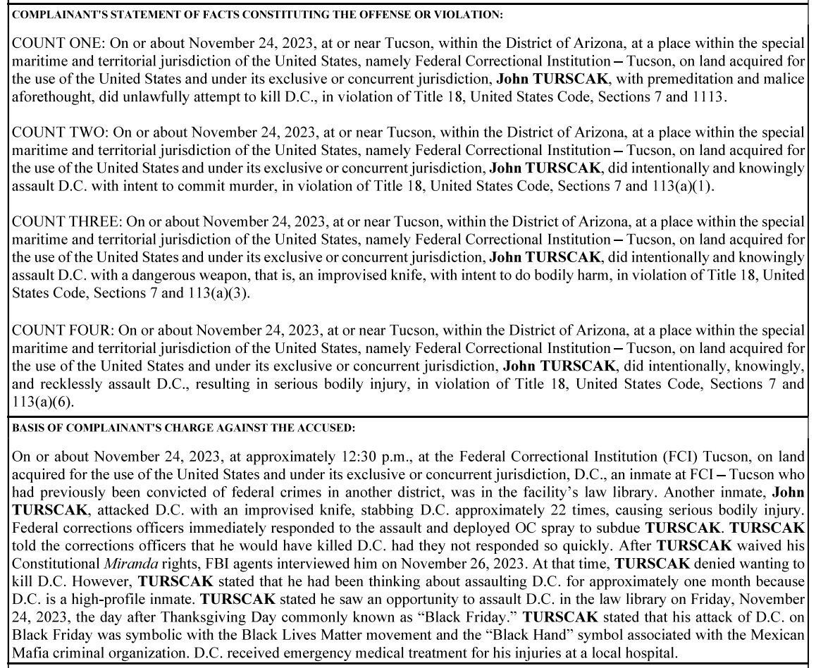 The man charged with trying to kill Derek Chauvin by stabbing him 22 times in prison was an FBI informant. John Turscak said he was inspired to try to kill Chauvin because of Black Friday which represented Black Lives Matter.